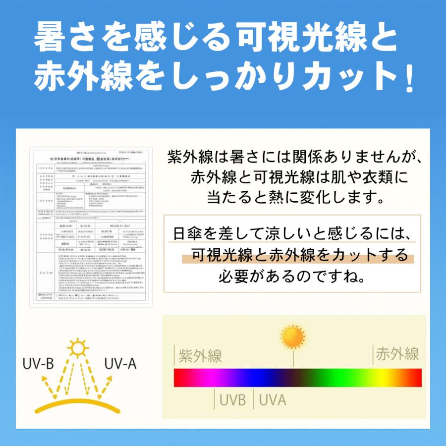 内側は黒色遮光生地、外側はサンブロックコーティングの二重構造で、照り返しの熱線も徹底カット。