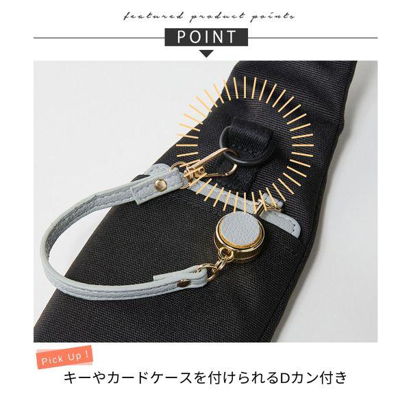 合計10個のポケットで、小物を分けてすっきり収納できます。肩ひもの両面にもポケットが付いており、スマホなどを入れておくのに便利です。